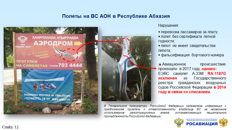 Самолет, на котором выполнялся полет, имел бортовые номера, указывающие на его принадлежность к Российской Федерации. Однако проведенная проверка показала, что самолет с таким бортовым номером был списан и исключен из российского реестра три года назад, в 2014 году. Таким образом, полеты выполнялись на воздушном судне с незаконно нанесенной атрибутикой, указывающей на его национальную принадлежность.