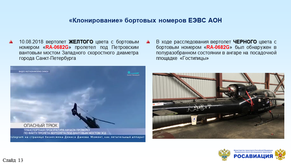 Один из наиболее вызывающих фактов такого «клонирования» бортовых номеров был выявлен при расследовании происшедшего 10 августа этого года инцидента с вертолетом, который пролетел под Петровским вантовым мостом Западного скоростного диаметра города Санкт-Петербурга. Гражданин, пилотировавший вертолет, не имел свидетельства пилота, полет выполнялся без уведомления органов ОВД.