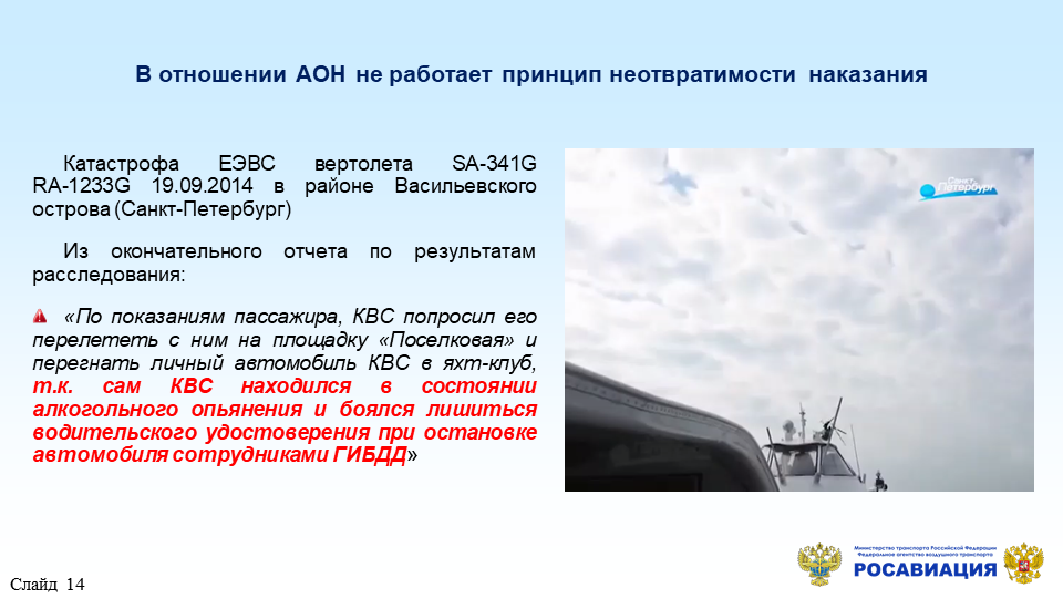 Росавиация считает целесообразным также воздержаться от принятия скоропалительных решений, дающих возможность для АОН выполнять авиаперевозки за плату, учитывая низкую «культуру безопасности», самодисциплины пилотов АОН, а также трудности урегулирования вопросов страхования жизни и здоровья пассажиров, и другое.