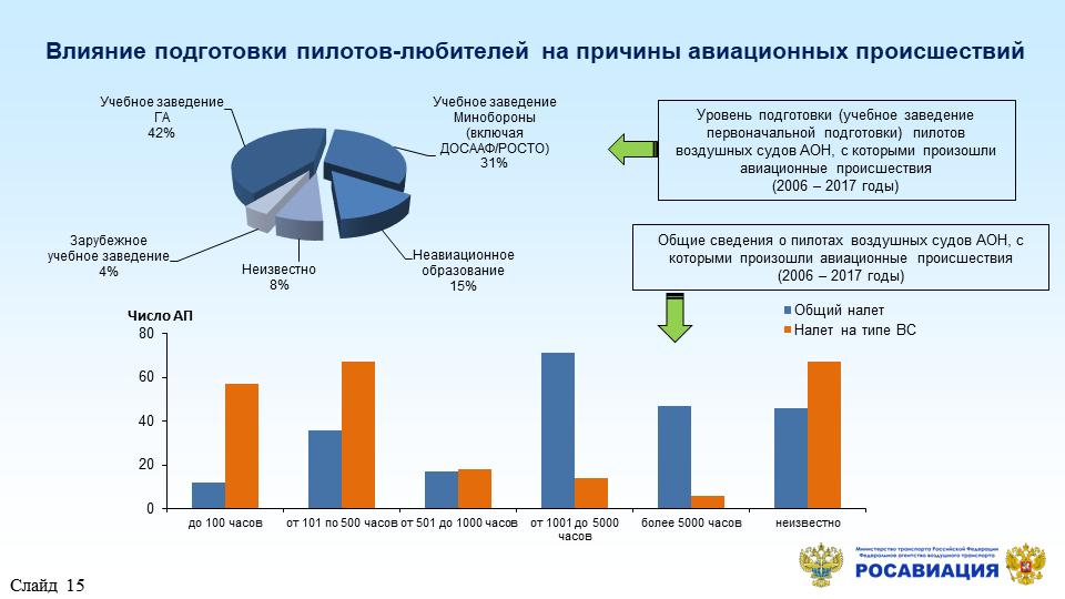 Статистические данные свидетельствуют о том, что авиационные происшествия в АОН чаще всего происходят с пилотами, имеющими базовое профессиональное авиационное образование в учебных заведениях гражданской или государственной авиации.