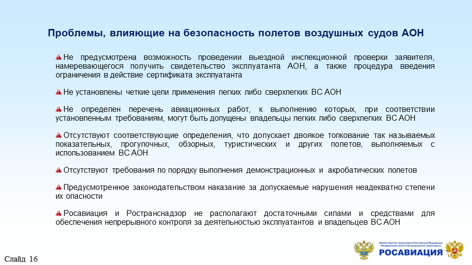 Вместе с тем, учитывая интенсивное развитие АОН и важное значение этой авиации для экономики страны и безопасности полетов, Росавиация уделяет большое внимание возникающим в этом сегменте проблемам.