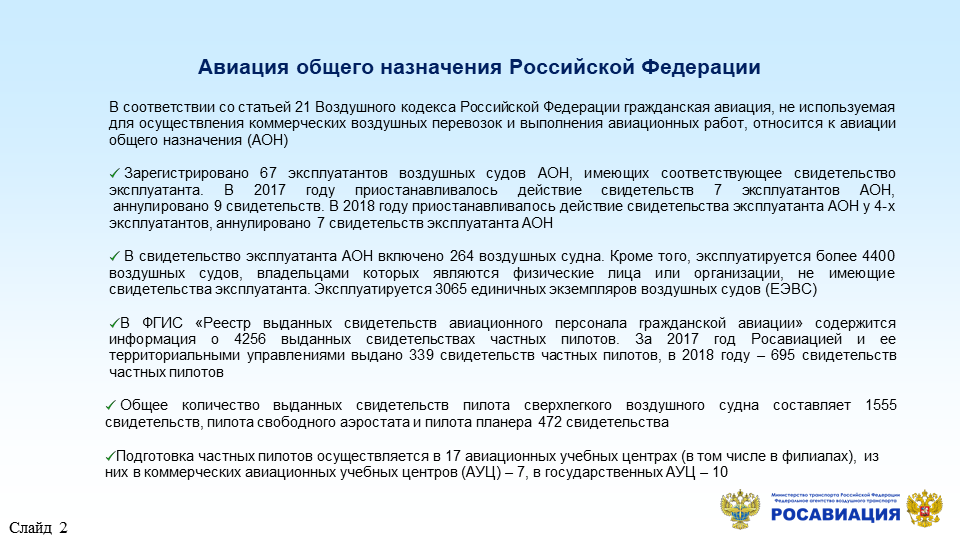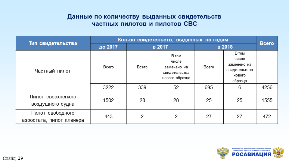 В Реестре выданных свидетельств авиационного персонала гражданской авиации содержится информация о 4256 выданных свидетельств частных пилотов. За 2017 год Росавиацией и ее территориальными органами выдано 339 свидетельств частных пилотов, в 2018 году – 695.