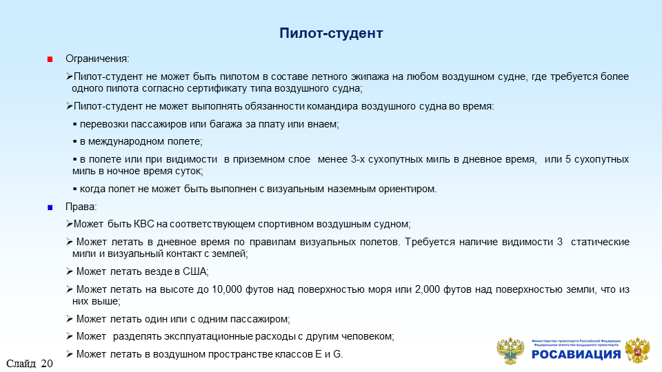 Также свидетельства частного пилота выдаются лицам, окончившим 1-й модуль подготовки по программе учебной и производственной практики подготовки коммерческих пилотов в Санкт-Петербургском государственном университете гражданской авиации и Ульяновском институте гражданской авиации имени главного маршала авиации Б.П. Бугаева.