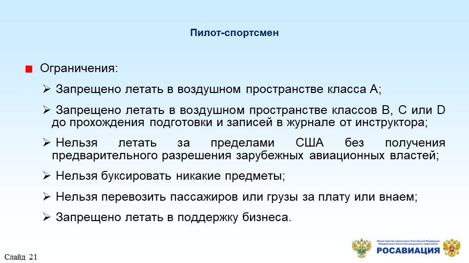 Кроме того, в зависимости от вида деятельности установлены четкие ограничения в спецификациях к сертификатам «Одиночный пилот-эксплуатант», «Одиночный эксплуатант – командир воздушного судна», «Базовый» и «Стандартный», в том числе по:
