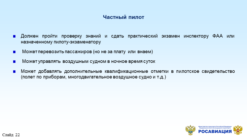 Таким образом, авиационные правила США устанавливают к частным пилотам, претендующим на выполнение воздушных перевозок за плату, практически такие же требования, предъявляемые к эксплуатантам, выполняющим коммерческие воздушные перевозки.