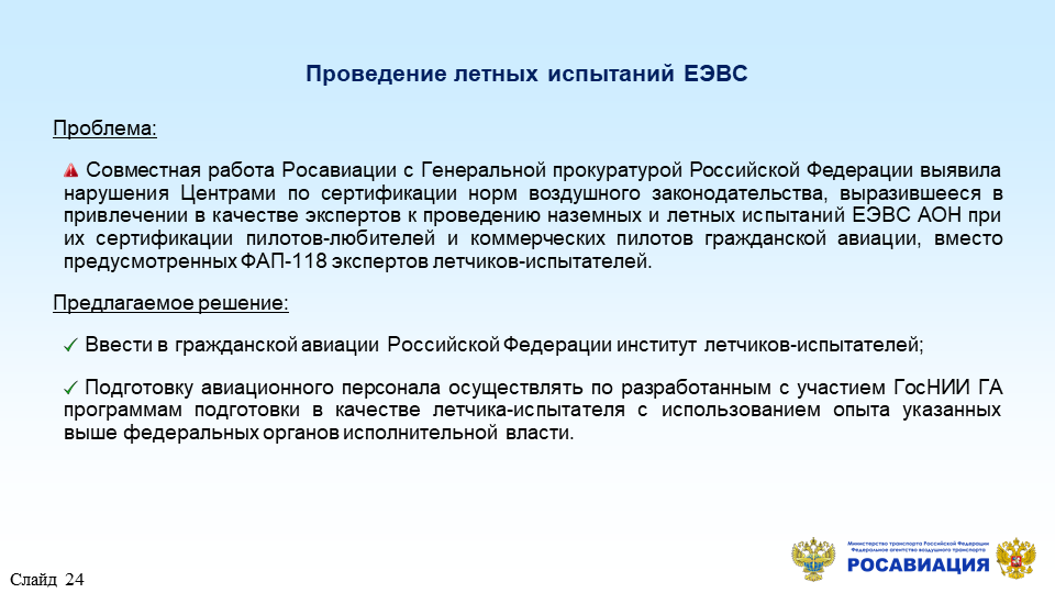 в Федеральные авиационные правила «Положение о порядке допуска к эксплуатации единичных экземпляров воздушных судов АОН»в части обеспечения возможности выполнения программы наземных и летных испытаний при продлении действующего сертификата летной годности авиационным персоналом гражданской авиации, удовлетворяющим требованиям ФАП-147, что позволило бы снизить остроту вопроса при проведении процедур продления действующего СЛГ ЕЭВС АОН. Предложения по данному вопросу уже направлялись в адрес Департамента государственной политики в области гражданской авиации Минтранса России, но каких-либо решений на настоящий момент не принято;