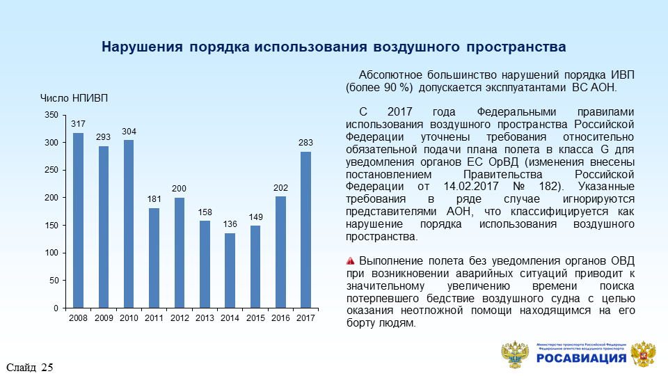 Отмечается рост числа нарушений порядка использования воздушного пространства Российской Федерации. Абсолютное большинство этих нарушений допускается эксплуатантами воздушных судов АОН.