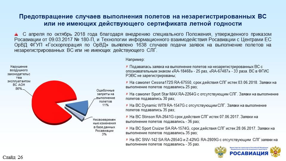 Из них около 11% информации представлено ошибочно (воздушные суда соответствовали требованиям воздушного законодательства, воздушные суда зарегистрированы в реестре государственной авиации и воздушные суда зарегистрированные в иностранных государствах). 3% информации относятся к несвоевременности внесения изменений во ФГИС РЭВС территориальным органами Росавиации. Остальные 86% информации о поданных заявках на выполнение полетов с нарушениями воздушного законодательства.