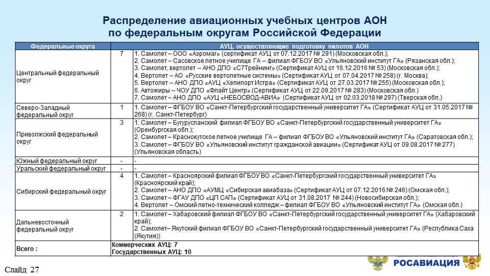 На слайде вы видите, как распределены российские АУЦ, в том числе филиалы, осуществляющие подготовку авиационных специалистов АОН, по федеральным округам.