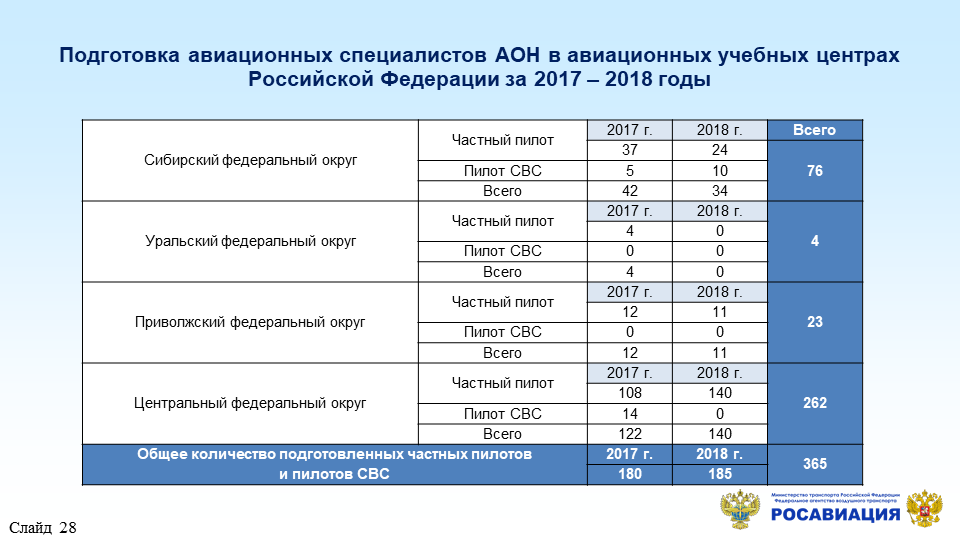 - в Центральном федеральном округе в 2017 году подготовлено 108 частных пилотов и 14 пилотов СВС, в 2018 году – 140 частных пилотов.