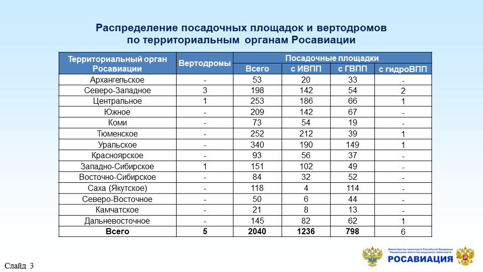 В настоящее время в государственном реестре аэродромов и вертодромов гражданской авиации Российской Федерации зарегистрировано 2040 посадочных площадок, из них 1236 с искусственным покрытием ВПП, 798 с грунтовой ВПП, 6 с гидроВПП, которые могут использоваться воздушными судами АОН. Распределение числа посадочных площадок и вертодромов по территориальным органам Росавиации представлено на слайде.