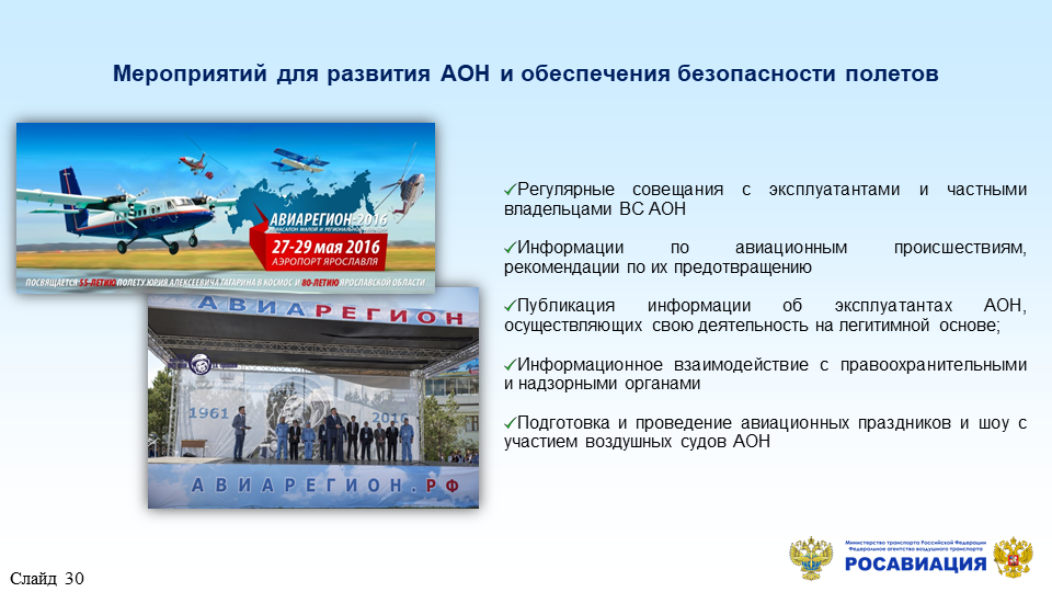 с учетом роста количества праздничных мероприятий, проводимых различными организациями и органами местного самоуправления с привлечением ВС АОН, Росавиацией и ее территориальными органами оказывается помощь, направленная на обеспечение безопасности полетов, в вопросах организации, обеспечения и выполнения полетов, в том числе принимается участие в согласовании программ их проведения. Для этого в соответствующие органы администраций субъектов Российской Федерации и муниципальных образований направлены обращения с предложением заблаговременно предоставлять информацию о запланированных в зоне ответственности территориального органа Росавиации праздничных мероприятиях с использованием гражданских ВС или их проведении на аэродромах, вертодромах, посадочных площадках гражданской авиации или аэродромах совместного базирования.