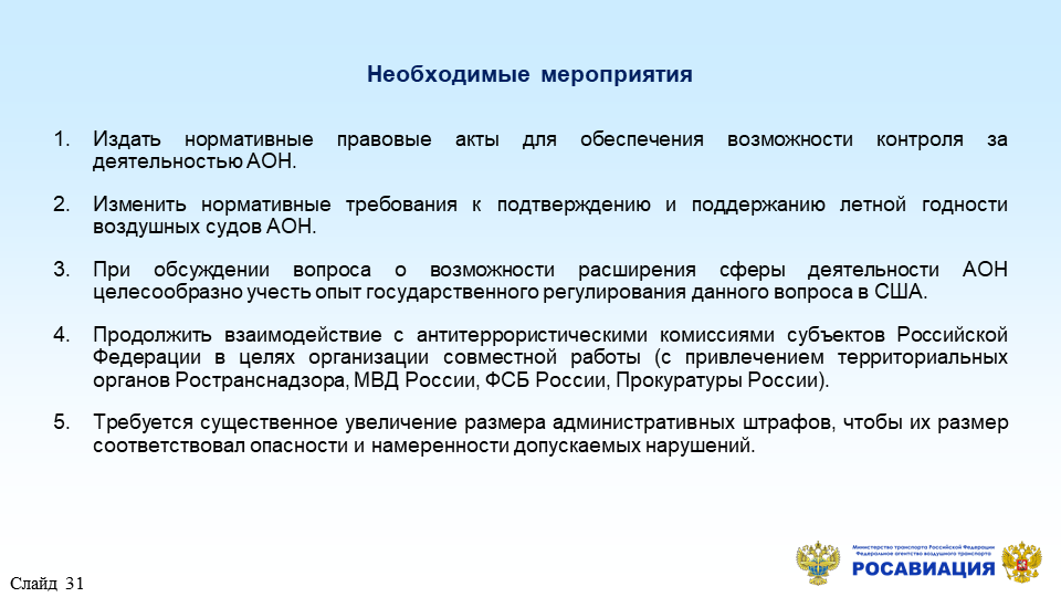 В Росавиацию неоднократно поступали проекты изменений в законодательные акты Российской Федерации в отношении регулирования деятельности АОН, в том числе – проекты изменений Воздушного кодекса Российской Федерации. По результатам рассмотрения Росавиация направляла предложения не вносить изменения в Воздушный кодекс, а внести изменения в действующие федеральные авиационные правила с целью гармонизации с международными стандартами ИКАО и лучшей международной практикой:
