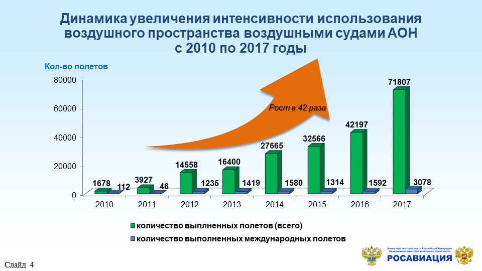 Так, если в 2010 году всего было выполнено 1678 полетов воздушных судов АОН, в том числе 112 международных полетов, то в 2017 году – уже 71807 и 3078 полетов соответственно. Таким образом, в период с 2010 по 2017 годы этот показатель увеличился более чем в 40 раз.
