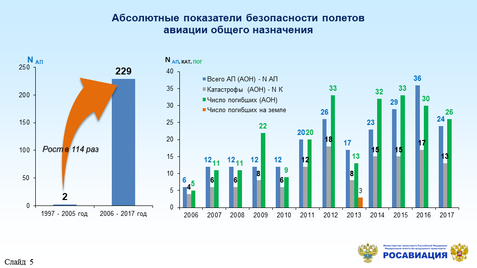 Соответственно, вопрос обеспечения безопасности полетов воздушных судов АОН начал набирать свою актуальность, также начиная с 2006 года. Для сравнения: если за период с 1997 года по 2005 год произошло лишь 2 авиационных происшествия, то за период с 2006 по 2017 годы в Российской Федерации с воздушными судами АОН произошло 229 авиационных происшествий, более половины из которых (55%) закончились катастрофами, в которых погибло 248 человек.