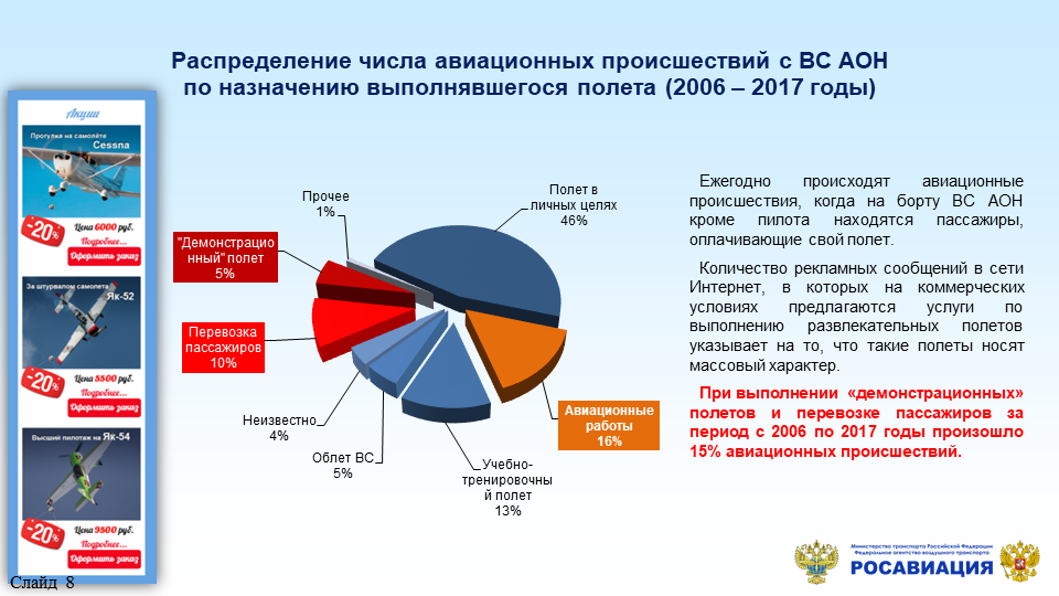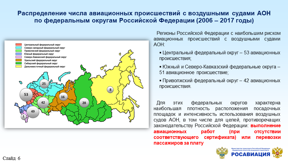 На долю этих федеральных округов за период с 2006 года приходится 64% всех авиационных происшествий. Вместе с тем следует отметить, что на территории этих округов и наибольшая плотность расположения посадочных площадок и интенсивность использования воздушных судов АОН, в том числе для целей, противоречащих законодательству Российской Федерации. В частности, требования воздушного законодательства Российской Федерации не допускают возможности выполнения эксплуатантом или частным владельцем воздушного судна АОН при отсутствии соответствующего сертификата на выполнение авиационных работ или перевозки пассажиров за плату.