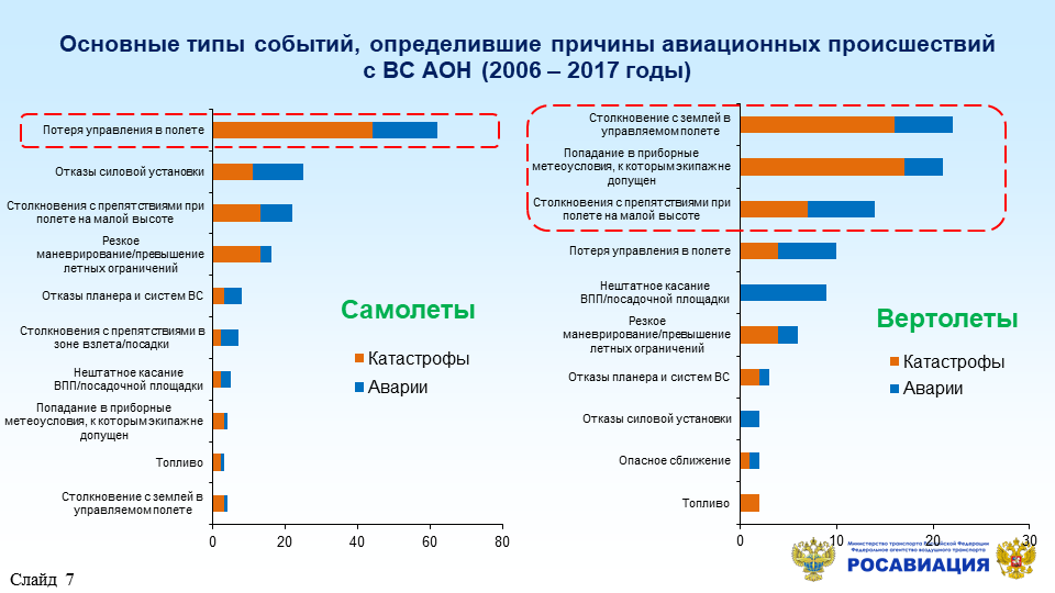 Для самолетов АОН наиболее распространенными авиационными происшествиями являются происшествия из-за потери управления в полете. Как правило, причина этих происшествий – попытка выполнить фигуры сложного или даже высшего пилотажа, получить необычные, острые ощущения, достичь границы возможностей как воздушного судна, так и самого пилота, переоценивая собственные навыки и пренебрегая летно-техническими характеристиками самолета. При этом результаты расследований таких авиационных событий показывают, что зачастую пилоты демонстрируют слабые знания в области законов и правил, касающихся выполнения функций обладателя свидетельства частного пилота, динамики полета и аэродинамики, общих знаний конструкции воздушного судна применительно к соответствующему виду воздушного судна, принципов эксплуатации и работы силовых установок, систем и приборного оборудования.