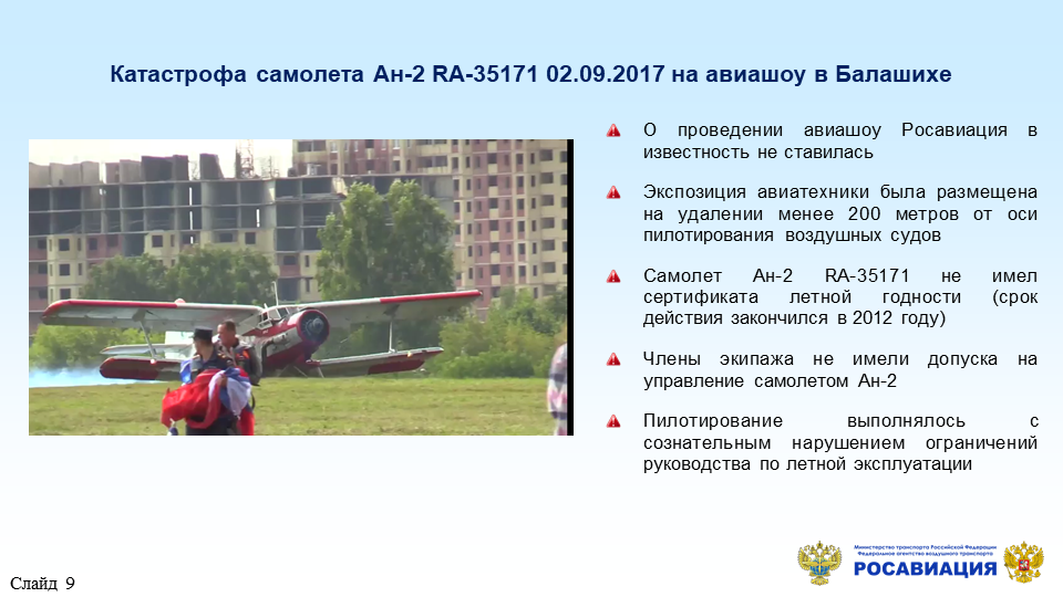 Информация о планируемом авиашоу с использованием воздушных судов гражданской авиации в Росавиацию не направлялась, что позволило организаторам привлечь к его проведению самолет Ан-2, срок действия сертификата летной годности которого истек 5 лет назад. Командир и второй пилот самолета не имели квалификационной отметки о допуске к полетам на самолете Ан-2. В заявке на использование воздушного пространства полет был ложно указан как учебно-тренировочный.