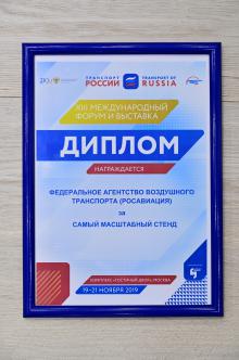 По итогам участия в выставке объединенный стенд Росавиации и подведомственных ей предприятий (ФГУП «Госкорпорация по ОрВД» и ФГУП «АГА(А)») был отмечен дипломом «За самый масштабный стенд».