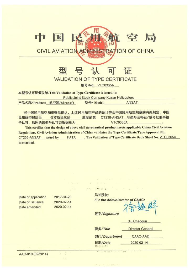 Выдача валидированного Сертификата типа вертолёта АНСАТ (№ VTC0365A) состоялась 14 февраля 2020 года по завершении работ в Китае, совместно проведенных Росавиацией и Управлением  гражданской авиации Китая (CAAC) c участием ПАО «Казанский вертолетный завод» в период с 2018 года.