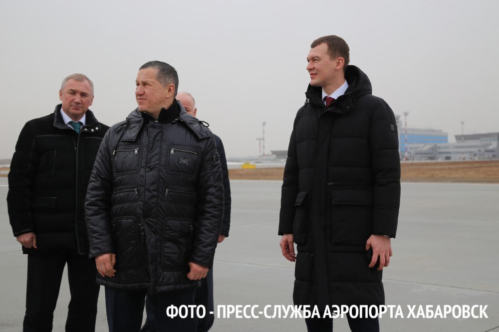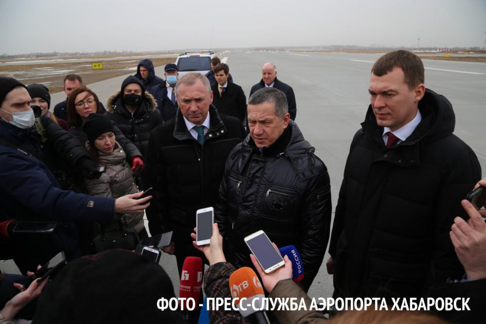 Сегодня, 16 марта 2021, с завершением первого этапа реконструкции аэродромного комплекса ознакомился Заместитель Председателя Правительства РФ – полномочный представитель Президента РФ в ДФО Юрий Трутнев и врио губернатора Хабаровского края Михаил Дегтярев. В мероприятии также принял участие начальник Дальневосточного межрегионального управления Росавиации Сергей Тараненко.