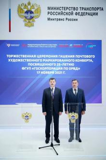 17 ноября на площадке XV Международной выставки «Транспорт России» состоялась официальная церемония гашения почтового художественного маркированного конверта, посвященного 25-летию ФГУП «Госкорпорация по ОрВД». В официальной части мероприятия приняли участие руководитель Федерального агентства воздушного транспорта Александр Нерадько и генеральный директор ФГУП «Госкорпорация по ОрВД» Игорь Моисеенко.