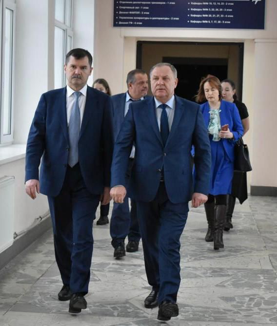 В ходе визита с ректором Университета Юрием Михальчевским были рассмотрены вопросы организации учебного процесса и его материально-технического обеспечение. Ректор доложил о том, что в этом году были выполнены работы по ремонту поточных аудиторий, косметическому ремонту фасада главного корпуса Университета, выполнен комплекс работ по ремонту в столовой Университета, полностью заменено все производственное оборудование, позволяющее обеспечить питанием учащихся и работников в полном объеме. Также построены универсальные спортивные площадки с искусственным покрытием и ночным освещением, которые используются для проведения различных культурно-массовых мероприятий, в том числе межвузовских. Обучающиеся по программам высшего и среднего профессионального образования бюджетной формы обучения, по направлениям подготовки авиационного персонала, обеспечены в полном объеме форменным обмундированием и бесплатным трехразовым питанием.